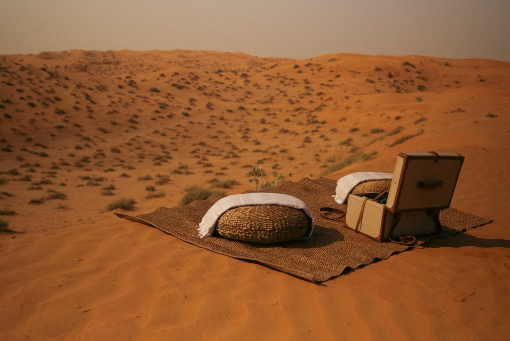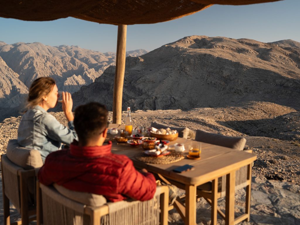 The journey itself becomes the first course. As guests are collected for the ascent into Jebel Al Hamri, the road stretches on, slowly unravelling the outside world. Along the way, a light picnic is prepared in advance by the culinary team, shaped by preferences shared before arrival. Menus vary from guest to guest, but the intention remains the same: food that refreshes and restores. A gently spiced chicken sandwich may be served alongside a separate, crisp salad, accompanied by grilled vegetables fragrant with herbs, hummus, pickles and a small sweet finish. Light and invigorating, the picnic is designed to awaken the senses, preparing the body long before the mountain comes into view.