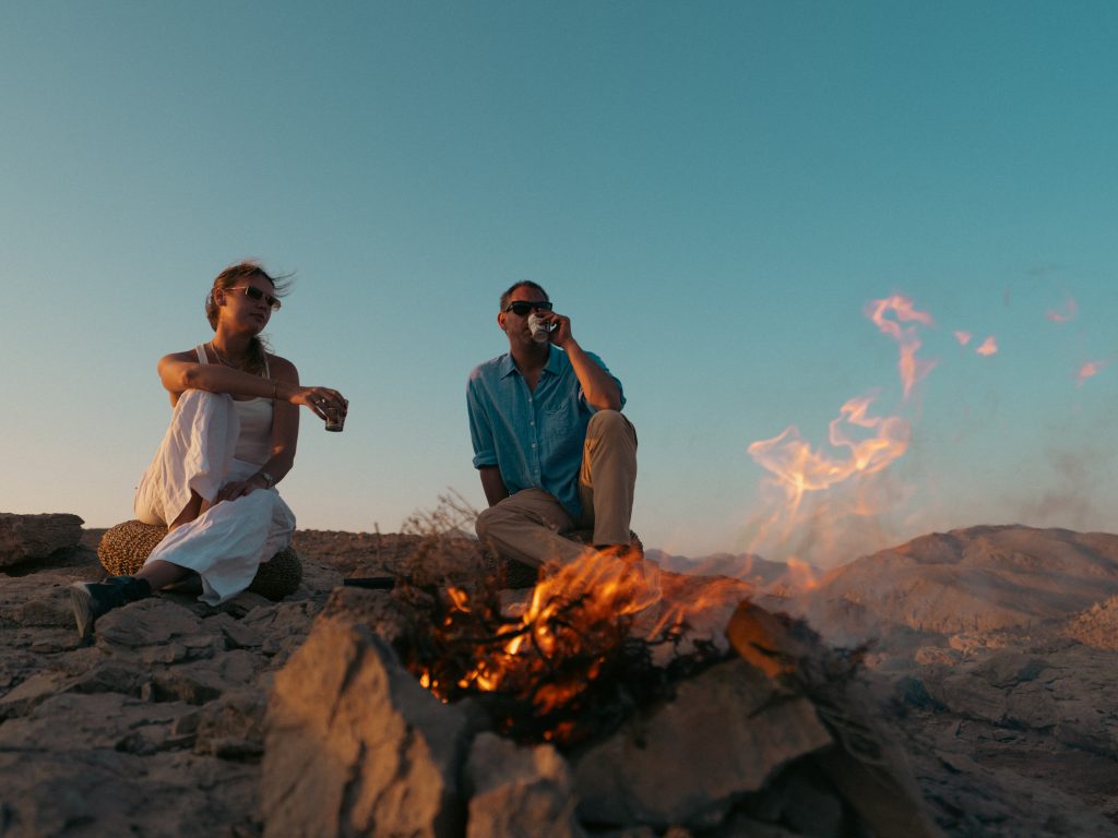 What follows is always considered and seasonal, changing from stay to stay. A meal might begin with fresh vegetables, followed by sardines grilled simply with herbs and served alongside freshly pressed juice. Chicken and meat may follow, fire-kissed, beautifully presented and unforced. Dessert can arrive warm, baked within half an orange peel, somewhere between cake and brownie, scented and elemental. The cooking is never renamed or reinterpreted; it speaks through fire, timing and restraint. Conversation fades naturally, replaced by the crackle of fire and the sound of wind moving through the wadi.
