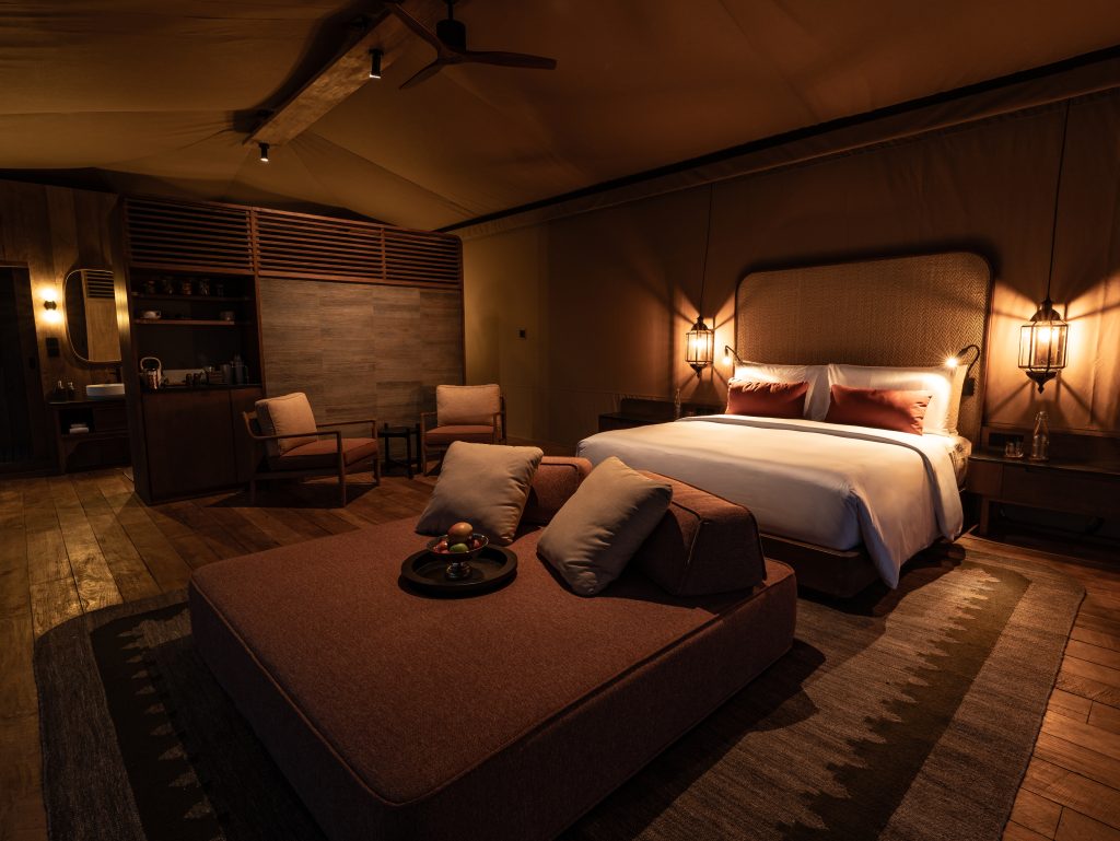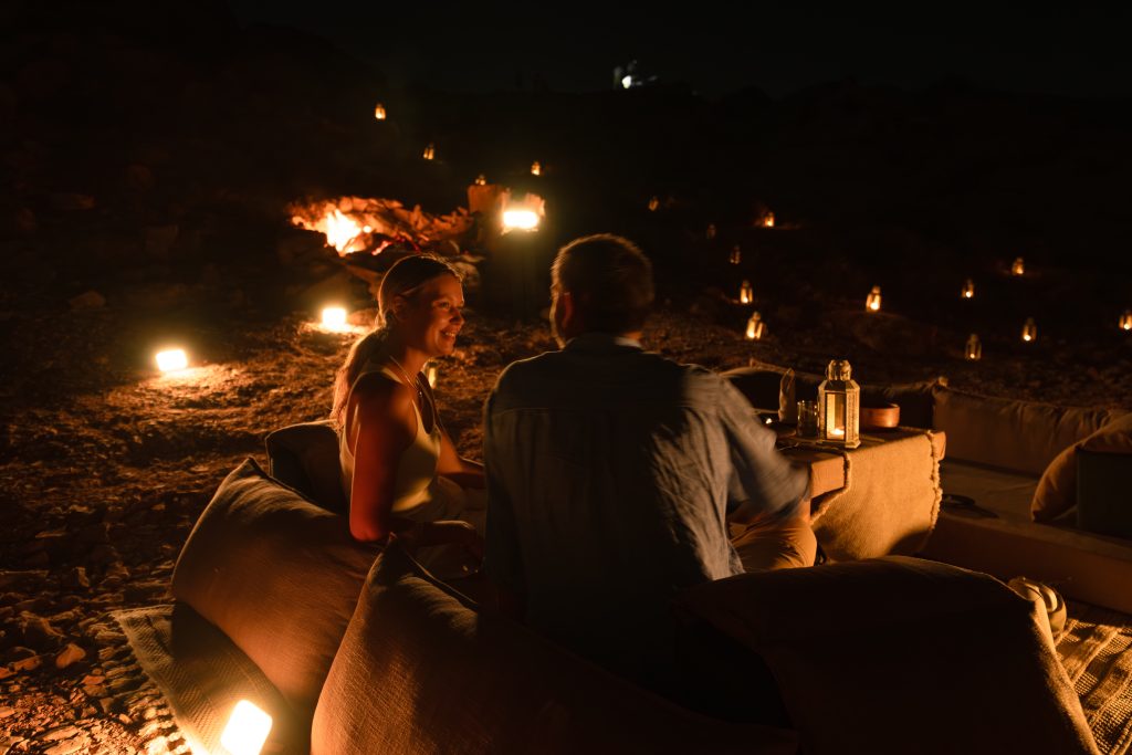 Dinner then draws guests further into the landscape, to a natural clearing resembling a wadi, where over seventy candles flicker against stone, and two fire pits warm the evening air. Here, the chef cooks entirely over open flame while a butler serves each course with quiet precision. There is no menu to choose from and nothing to order; dinner is composed in advance, shaped around dietary preferences and allergies shared before arrival, allowing guests to surrender the final decisions of the day, leaving room for surprise to unfold.