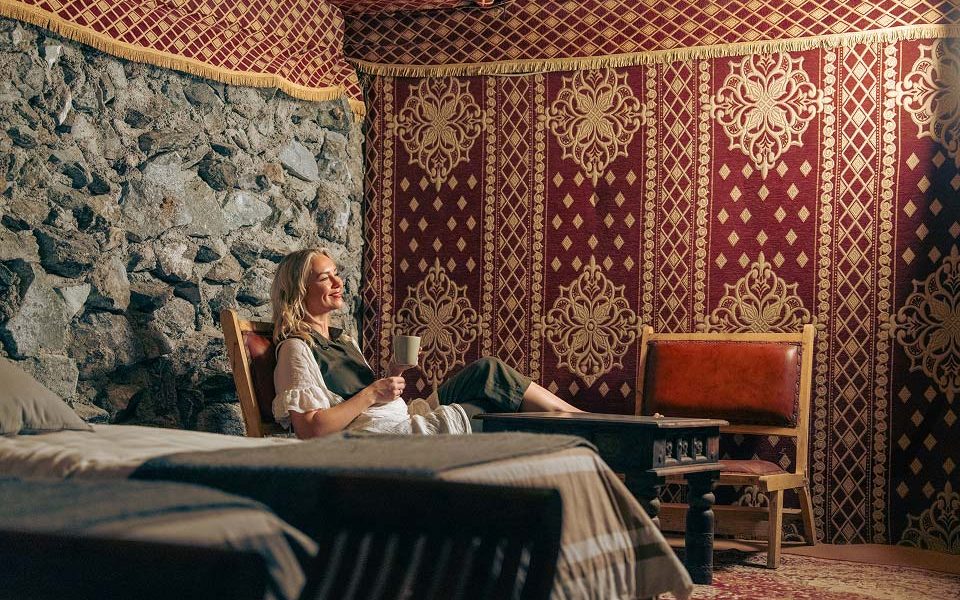 Under starlit skies, heritage performances including Al Ayala and Yola drumming bring the spirit of the desert alive, a celebration of unity, courage, and storytelling. A professional astronomy guide then reveals constellations once used by Bedouins to navigate their long desert crossings, before guests retire to hand-built stone dwellings crafted from natural materials such as woven goat hair, Sadu fabric, natural wood and mountain stones, inspired by the traditional techniques the Bedouins once used to