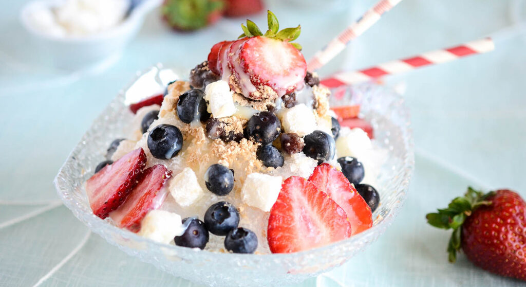 Bingsu is a popular Korean shaved ice dessert that’s especially refreshing during the summer months. The finely shaved ice is layered with sweetened condensed milk, red bean paste, fruit, and sometimes chewy rice cakes (tteok). The layers of toppings add flavor and texture to the icy base, offering a perfect balance of sweetness and coolness.