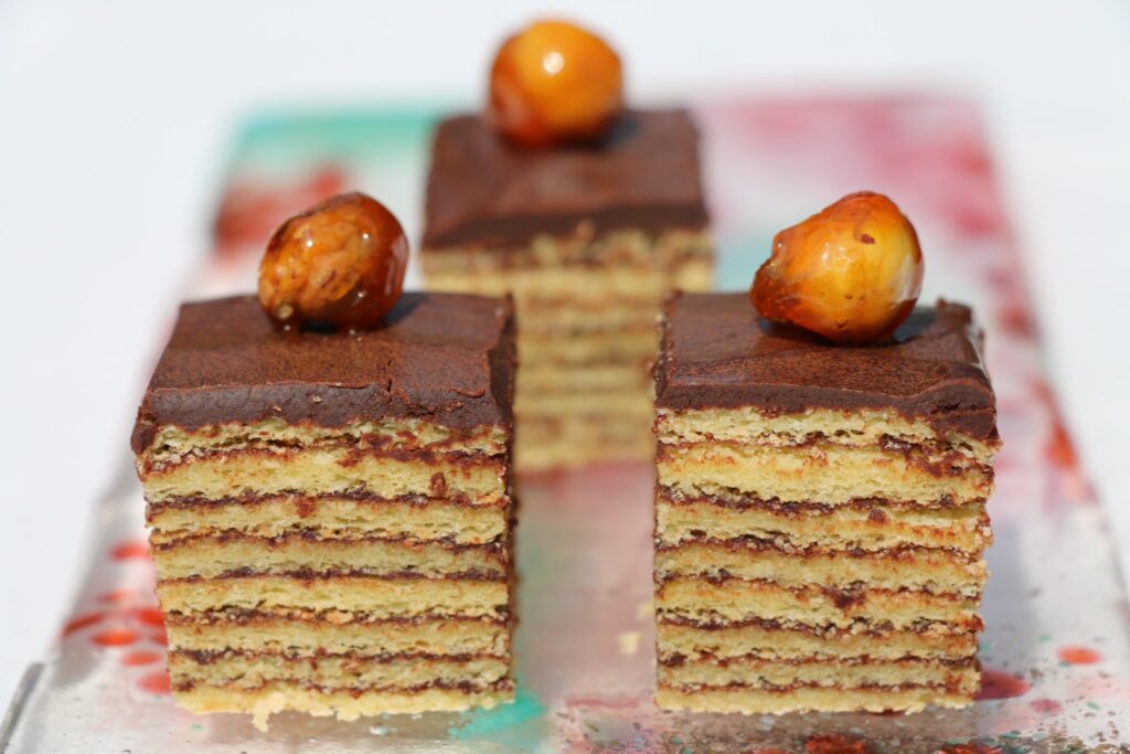 A traditional Hungarian cake, Dobos Torte features multiple layers of light sponge cake filled with rich chocolate buttercream. The top layer is covered with a thin, glossy caramel glaze, offering a crunchy contrast to the soft, creamy layers below. This iconic dessert is both elegant and indulgent, often served at celebrations in Hungary.